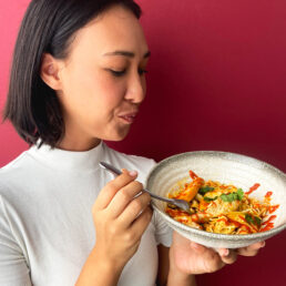 Stir to dissolve the vegetable stock cube then add the coconut milk and miso paste. Stir to dissolve the miso paste then increase the heat to high.